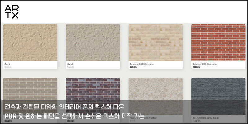 특이사항: 100% 무료로 다양한 풍의 텍스쳐 다운가능, 이외에 3D 에셋과 SBSAR, HDRI 파일 제공