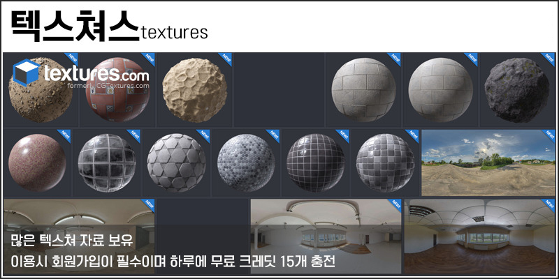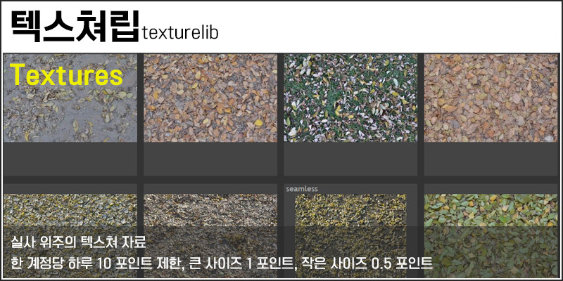 특이사항: 실사 위주의 텍스쳐 자료가 많음 / 단, 하루에 10포인트로 제한되며 큰 사이즈 1포인트, 작은 사이즈 0.5 포인트가 차감됩니다.