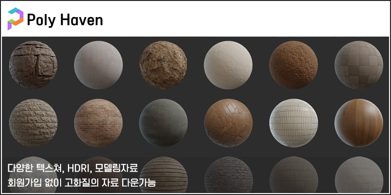특이사항: 다양한 텍스쳐 및 HDRI 자료 보유, 카테고리별로 정리가 잘 되어있으며 회원가입하지 않아도 고화질의 자료들을 받을 수 있습니다.. / 기존 TextureHaven 사이트와 HDRI + 3D 모델 추가로 PolyHaven으로 변경되었습니다.