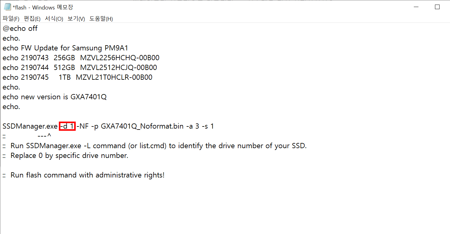 08. 업데이트 폴더 내에 flash.cmd라는 파일이 보일 겁니다. 해당 파일을 메모장을 실행하고 그위로 드래그해주면 위처럼 나옵니다. 그다음 위에서 본(07번) 경로에 맞는 번호로 입력 후 저장합니다.