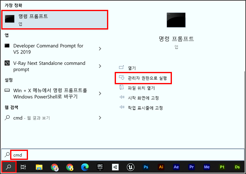 02. 그다음 좌측 하단에 있는 검색창을 누르고 CMD를 검색해줍니다. 그리고 명령 프롬프트를 관리자 권한으로 실행합니다. (혹은 Ctrl + R후 cmd 입력)