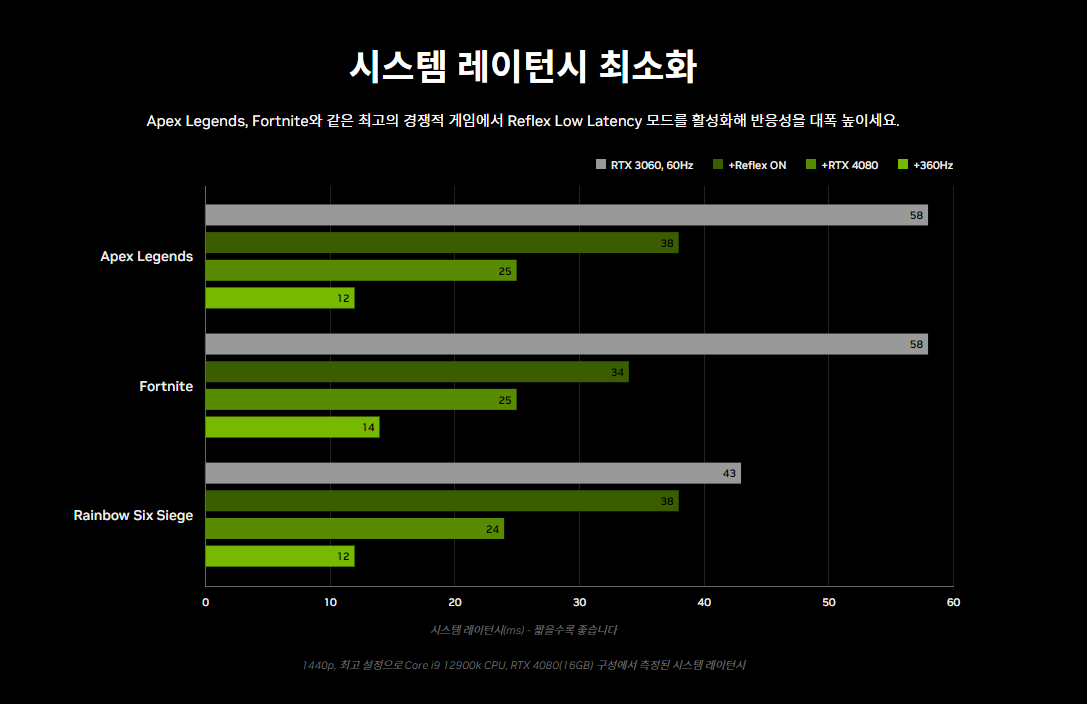 NVIDIA Reflex 및 GeForce RTX 40 시리즈 GPU는 가장 낮은 시스템 레이턴시와 최고의 반응성을 제공하여 궁극의 경쟁력을 선사합니다. 시스템 레이턴시를 최적화하고 측정하도록 제작된 Reflex는 더욱 빠른 타깃 포착, 더 빠른 반응 시간과 경쟁 게임에서 최고의 조준 정확도를 제공합니다.