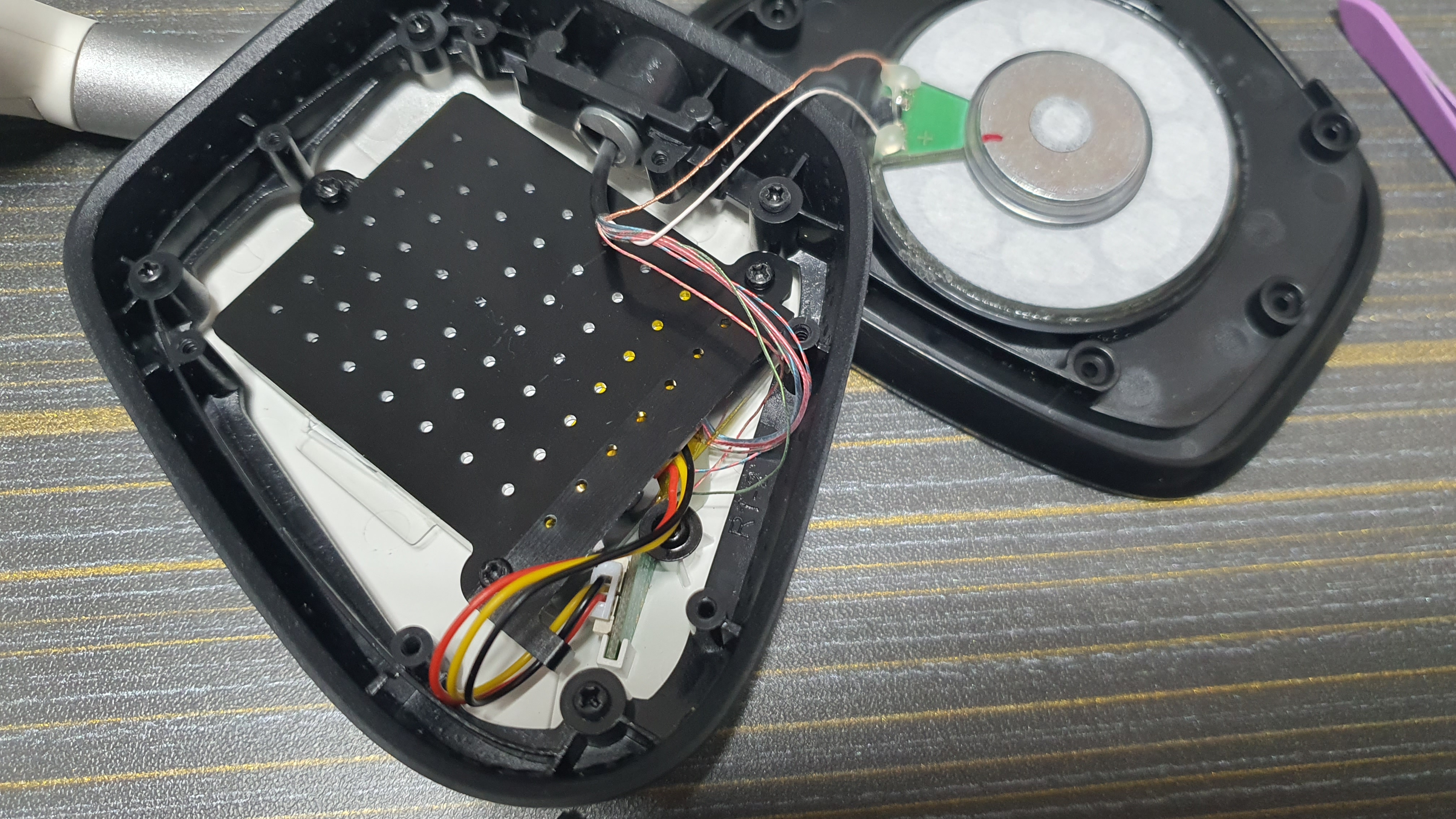 마이크 쪽은 무선 어댑터등이 포함된 기판이 있어서, 그 반대편인 마이크가 없는 곳을 열어야 해요