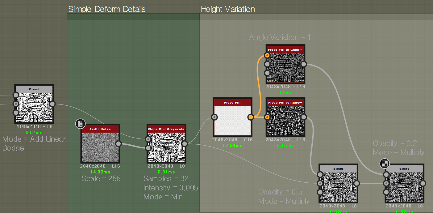 Perlin Noise와 Slope Blur로 간단한 디테일을 추가해 주고, Flood Fill 노드를 통하여 to Gradient, to Random으로 각각의 무작위 높이값들을 설정해 줍니다. Slope 정보를 받아와서 Random을 Blend / Multiply로 합성해 주고, Gradient로도 추가로 합성해 줍니다.