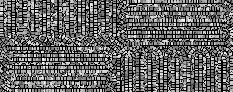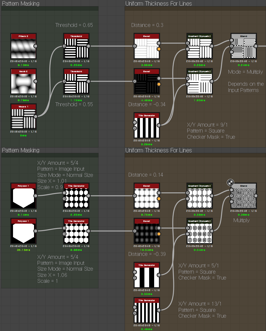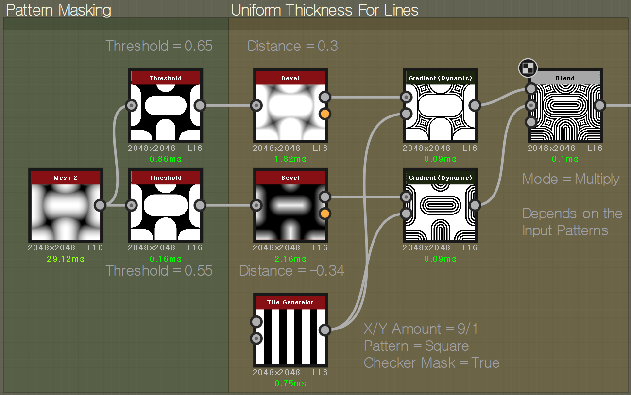 Mesh 2 노드로 기본 형태를 잡으면서 시작합니다. Threshold 노드로 경계를 뚜렷하게 잡습니다 각각 수치가 소폭으로 차이가 납니다. 그리고 각각 Bevel 노드로 외부(플러스)와 내부(마이너스) 형태로 외, 내부 모양을 잡습니다. 이어서 Tile Generator를 사용해서 줄무늬 패턴을 만들고 Gradient (Dynamic)으로 연결해 준 뒤 Blend / Multiply로 곱연산하면서 합쳐줍니다.