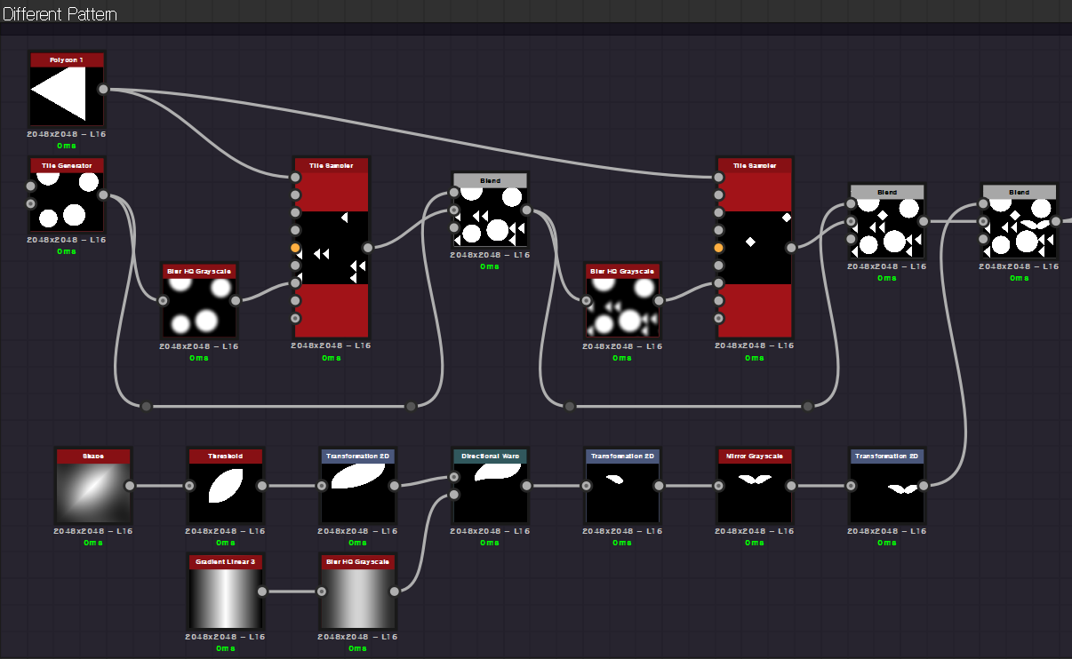 두 가지 스캐터 노드를 Blend / Subtract로 빼줍니다. 이 모양을 가지고 Blur HQ로 확장되게 한 후 Threshold 노드에서 Lower Mode로 낮은 값들로 날카롭게 모양을 잡아냅니다. Cells 4 - Edge Detect 노드를 사용하여 무작위로 경계선 형태를 만들고, Blend / Multiply로 합성을 해줍니다. 이어서 만들어진 두 노드를 Blend / Add Linear Dodge로 합성해 줍니다.