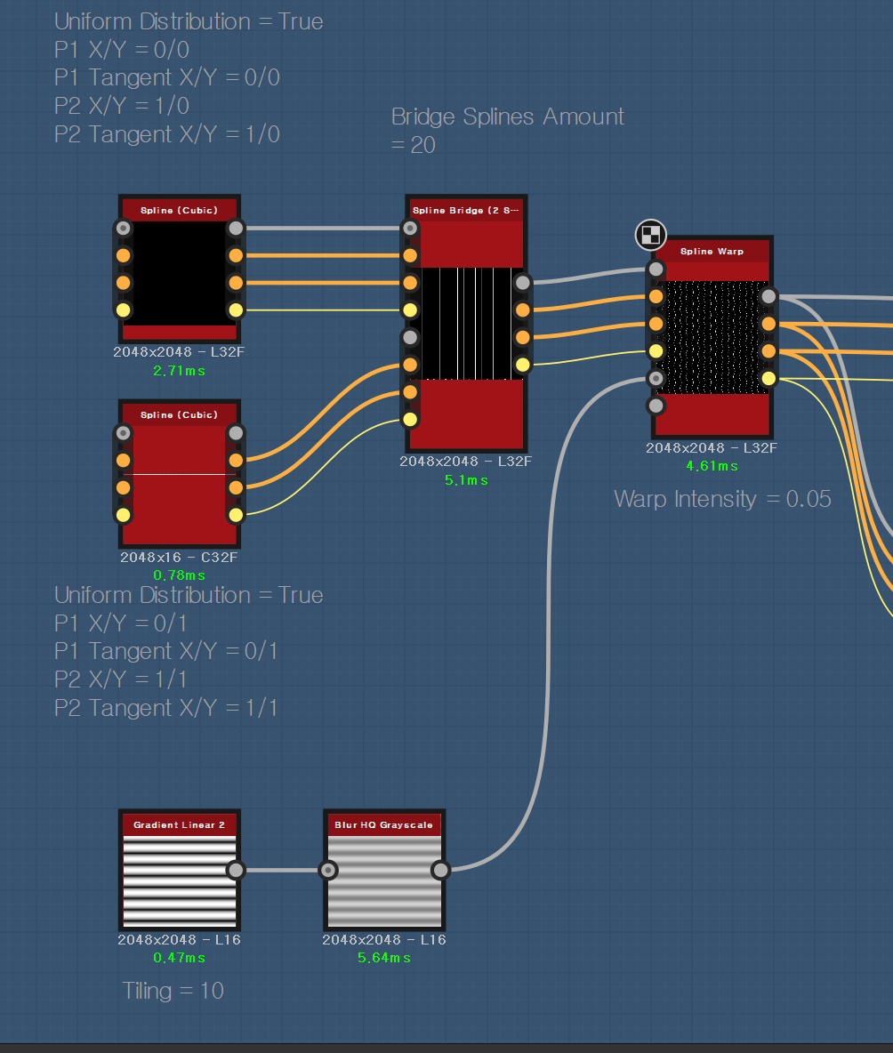 그다음 Spline Warp 노드로 연결시켜줍니다. 이후 Gradient Linear 2 노드로 수평으로 타일링되게 10으로 설정해준 뒤 Blur HQ로 부드럽게 보간해줍니다. 여기서 생성된 워프 노드로 연결해 주면 부드럽게 곡선 변형을 할 수 있습니다.