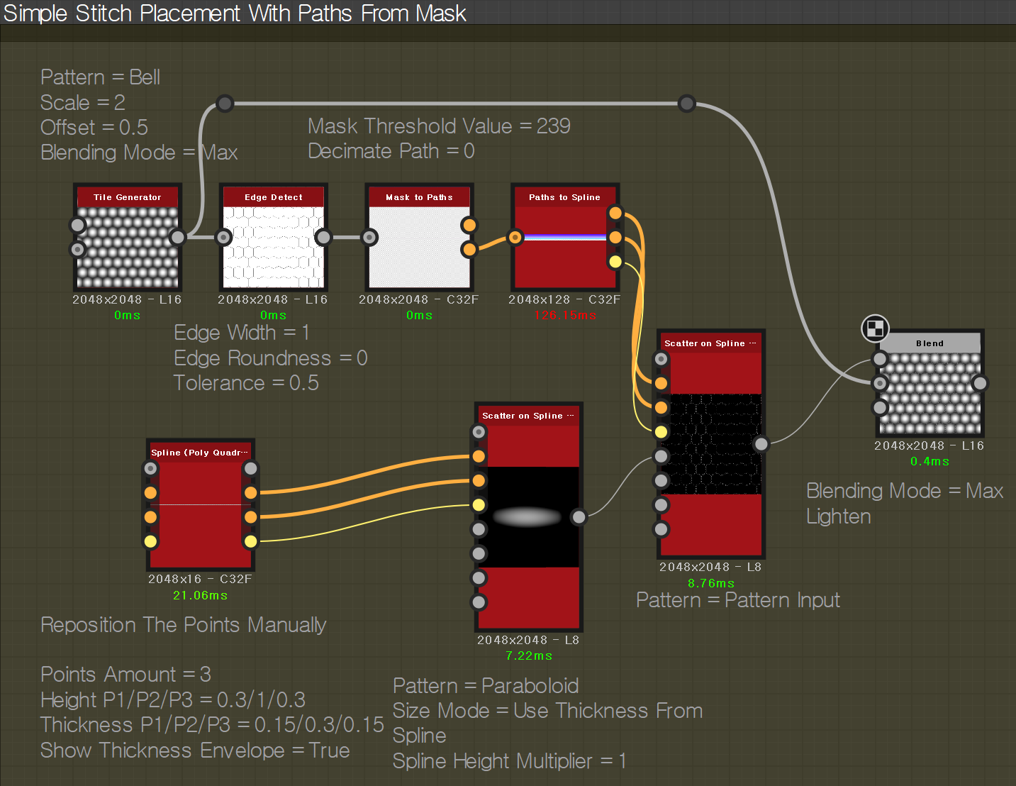 Mask To Paths 노드와 Paths To Spline 노드를 함께 사용하면 위와 같은 퀼팅 가죽에 대한 패턴을 얻을 수 있습니다.