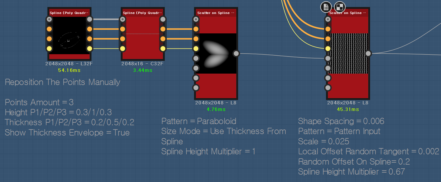 Spline (Poly Quadratic) 노드를 생성합니다. Show Thickness Envelope 값을 활성화합니다. p1/p2/p3 세 점의 모양을 얻을 수 있습니다. 이 노드를 복제하고 Scatter on Spline Grayscale로 연결합니다. 수동으로 두 번째 노드를 조정하여 V 모양을 만들어 줍니다. Size Mode를 Use Thickness From Spline으로 변경하면 두께가 나옵니다. Spline Height Multiplier를 1로 늘려줍니다. 이렇게 하여 Spline (Poly Quadratic) 노드의 높이 값을 사용하게 됩니다.
