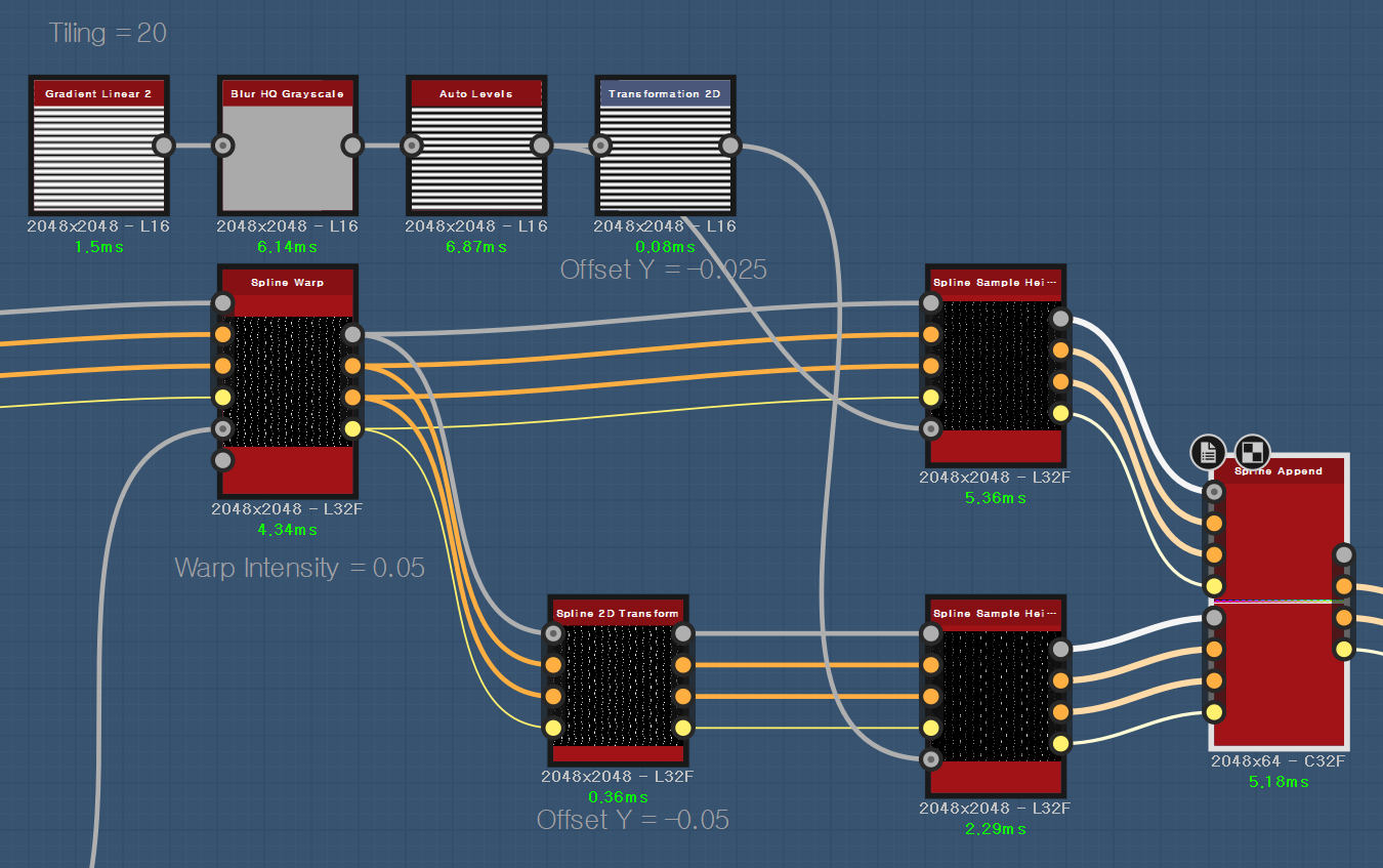 Gradient Linear 2 노드로 수평 타일링을 만들어주고 Blur HQ로 흐려지게 해준후 Auto Levels로 0-1 범위에 대해 자동으로 강도를 설정해 줍니다. 이어서 Spline Sample Height 노드 Height 맵으로 연결합니다. 한 가지는 Transformation 2D 노드에 연결해서 Y 방향으로 오프셋을 준다음 두 번째 Spline Sample Height 노드 Height 맵으로 연결합니다. 이어서 Spline Append 노드로 합쳐줍니다.